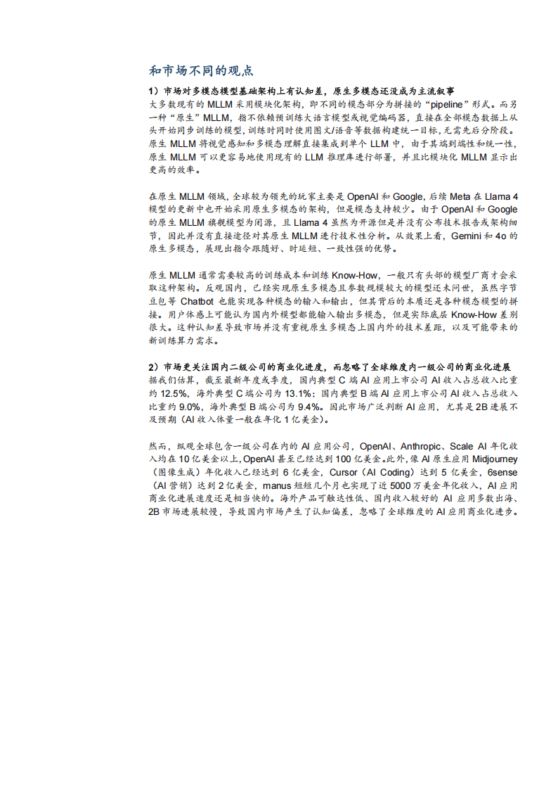 在商业化方面,海外市场的进展显著快于国内。目前,全球年化收入超过1亿美金的AI产品中,不少出自海外的多模态初创公司。尽管如此,国内的多模态出海产品依然表现出色。在2C和2B领域,国内上市公司的AI收入贡献与海外相比,差距并不明显。这得益于国内厂商在多模态产品上的持续迭代与创新,如图像生成技术从追求高质量逐渐转向提升易用性,视频生成领域国内厂商也取得了显著进步。