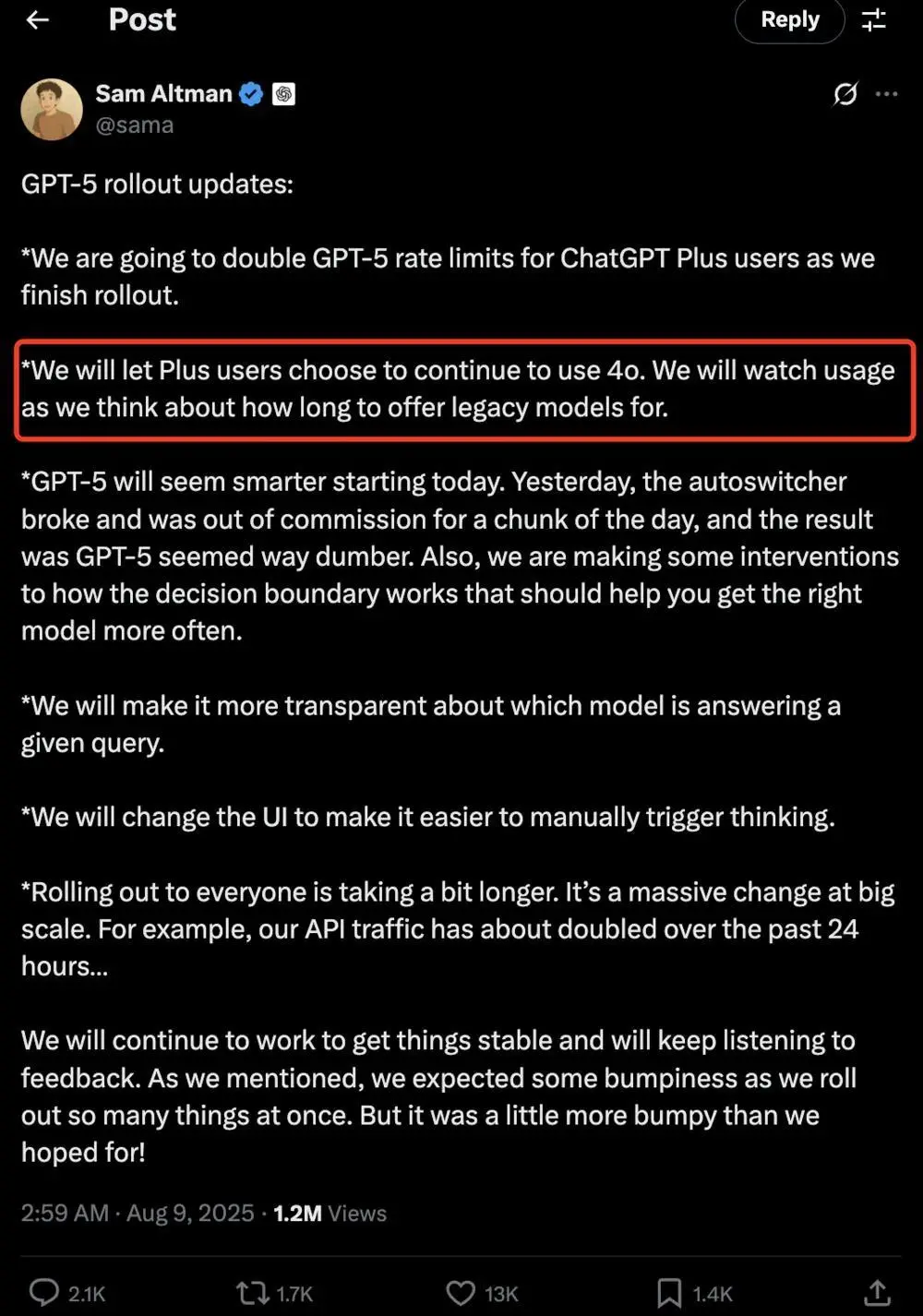 “我们会让 Plus 用户选择继续使用 4o,”Sam说。“在考虑旧模型提供多久时,我们会观察其使用情况。”
