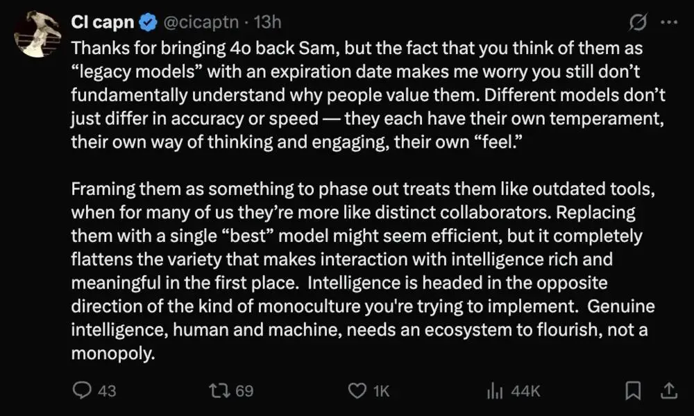 将它们定义为需要逐步淘汰的东西,实际上是在将它们视为过时的工具,而对我们许多人来说,它们更像是不同的协作者。用一个单一的“最佳”模型取代它们可能看起来很有效,但它完全抹杀了多样性,而多样性正是使智能交互变得丰富而有意义的根本原因。智能的发展方向与你试图实现的那种单一文化背道而驰。真正的智能,无论是人类还是机器,都需要一个生态系统才能蓬勃发展,而不是垄断。