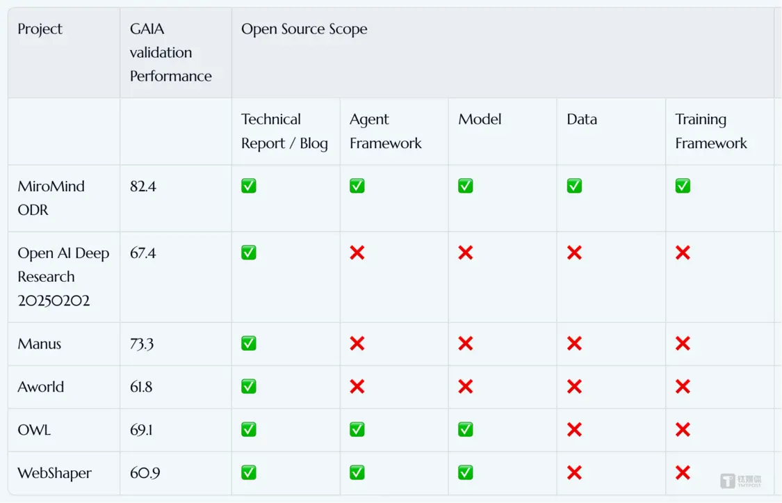 “经过一个季度的努力,MiroMind正式亮相并发布我们重磅开源项目。Miro ODR完全开源且可复现,核心模型、数据、训练流程、AI Infra、DR Agent框架统统开源,复现无压力。”代季峰透露,团队将以每月一次开源更新的速度,同社区一起创作最强深度研究模型。